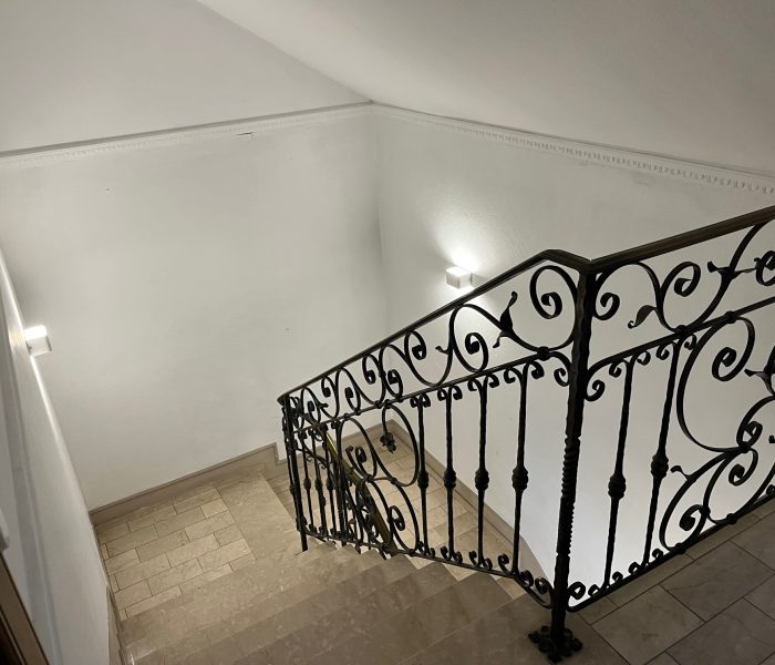 Durch den sehr imposant gestalteten äußerlichen Eingangsbereich gelangen Sie in das Stiegenhaus, wo sich der Zugang zu den Wohnungen 1 und 2 sowie in die Kellerräumlichkeiten befinden.